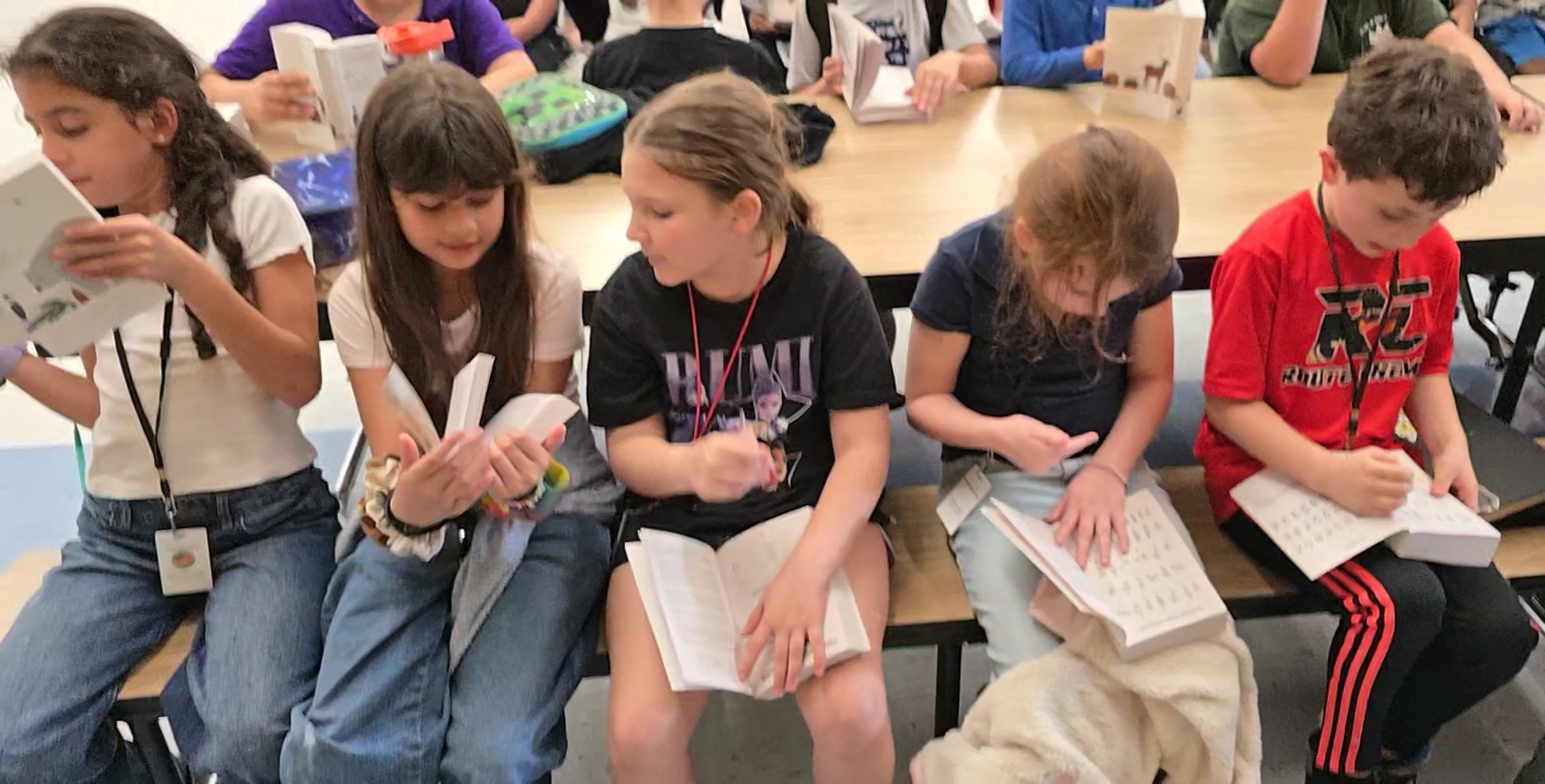 One student was so excited about his new book that he asked if he could keep it in his bookbag, while another eagerly explored the animal habitat section. Soon, the cafeteria buzzed with excitement as friends shared new words and showed each other the many resources they discovered, including information on clouds, the water cycle, sign language, and maps of the world—just to name a few of the featured resources.